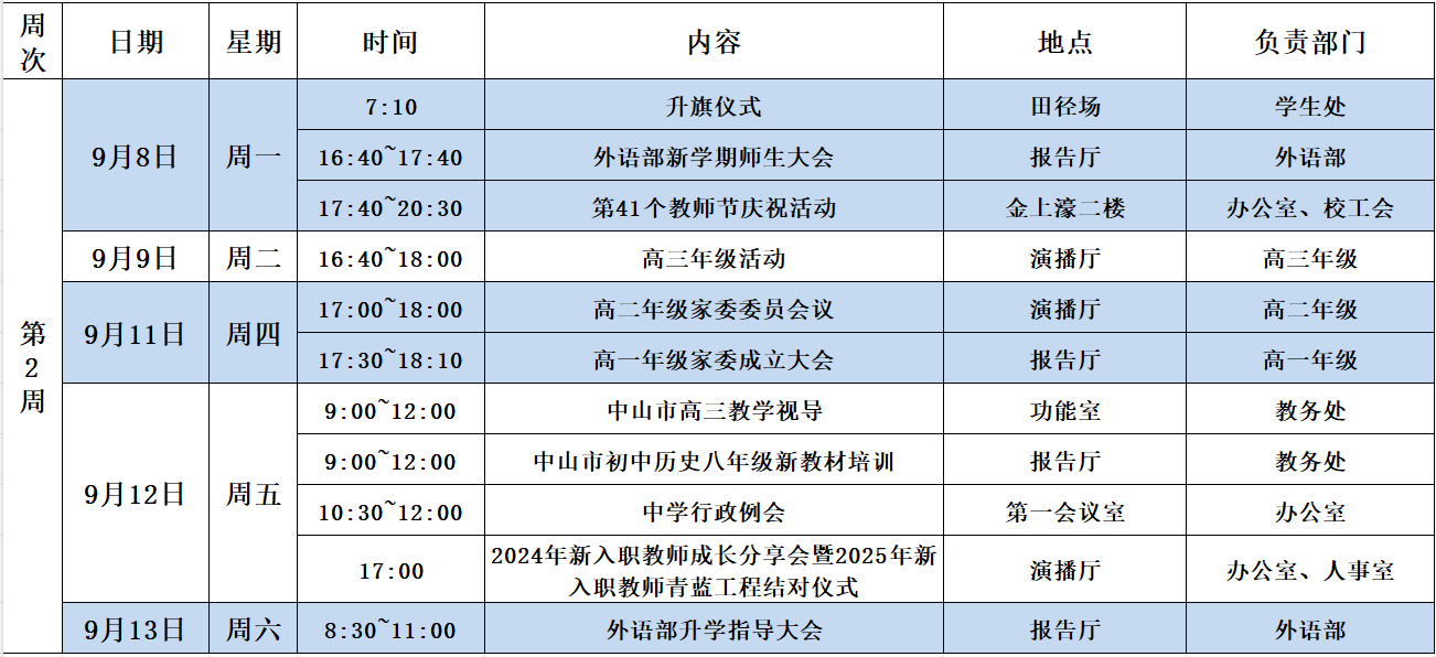 第2周中学校区工作安排(2025~2026学年第一学期9月7日~9月13日)
