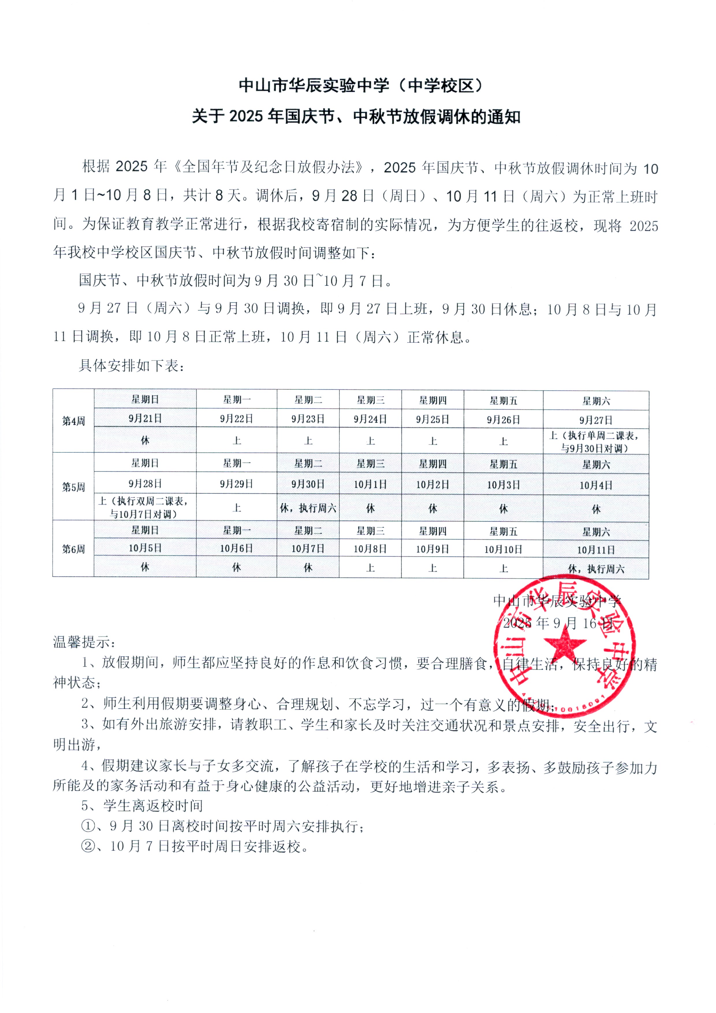 中山市华辰实验中学(中学校区)关于2025年国庆节、中秋节放假调休的通知