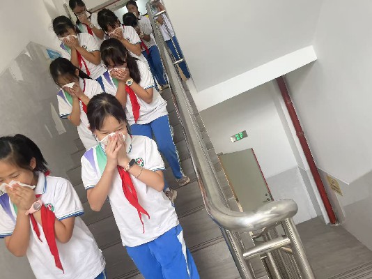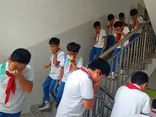 演练哨声准时响起,学生迅速穿好鞋子,按照要求用湿毛巾或纸巾捂住口鼻,沿预定疏散路线弯腰前行,全程保持安静有序,无拥挤、打闹现象。与此同时,楼道拐角、楼梯口等关键位置的负责老师迅速到位,实时维持现场秩序,及时应对突发情况,为师生疏散保驾护航。