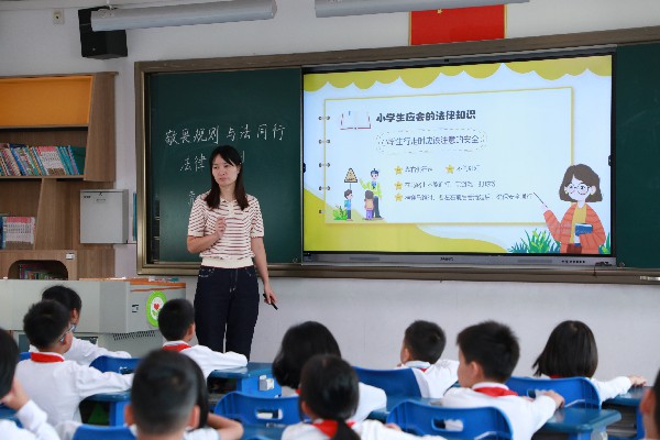 班会伊始,班主任通过趣味问答引出“法律是什么”的核心话题,讲解了与小学生密切相关的《中华人民共和国宪法》《中华人民共和国未成年人保护法》等法律,结合交通规则等生活实例,强调 “靠右侧行走、不闯红灯、横穿马路要观察”等安全常识,还明确了 12 周岁以上才能骑自行车和18 周岁以上方可驾驶机动车的法律规定。