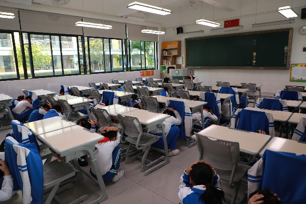 图二:同学们蹲至课桌下或课桌旁做好防护