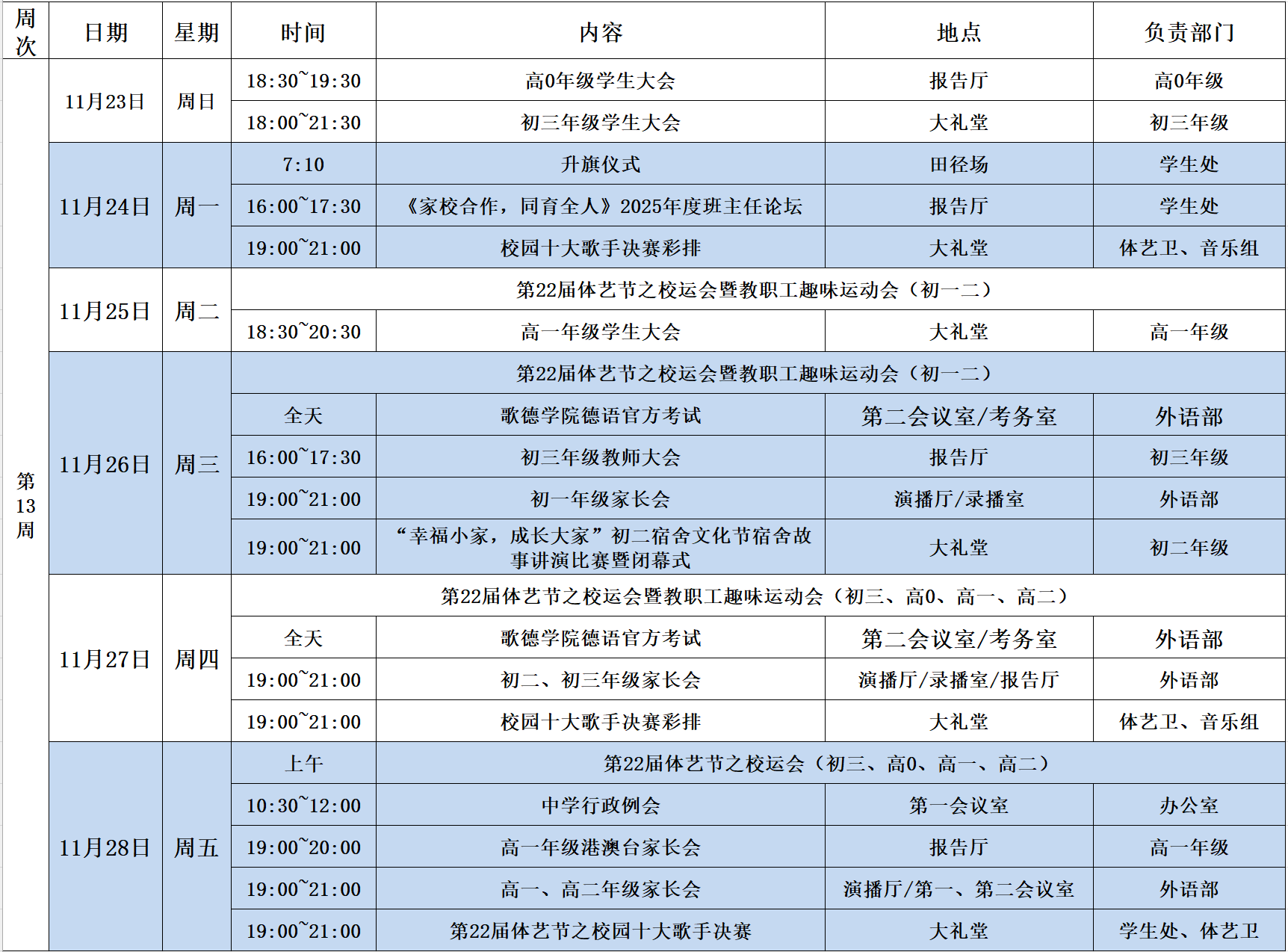第13周中学校区工作安排(11月23日~11月29日)
