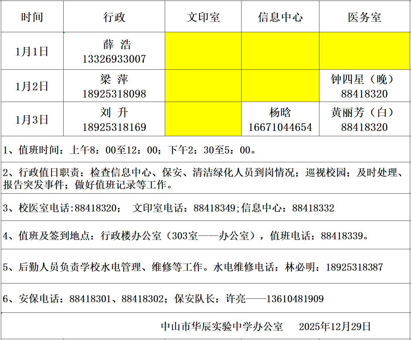 2026年元旦值日安排