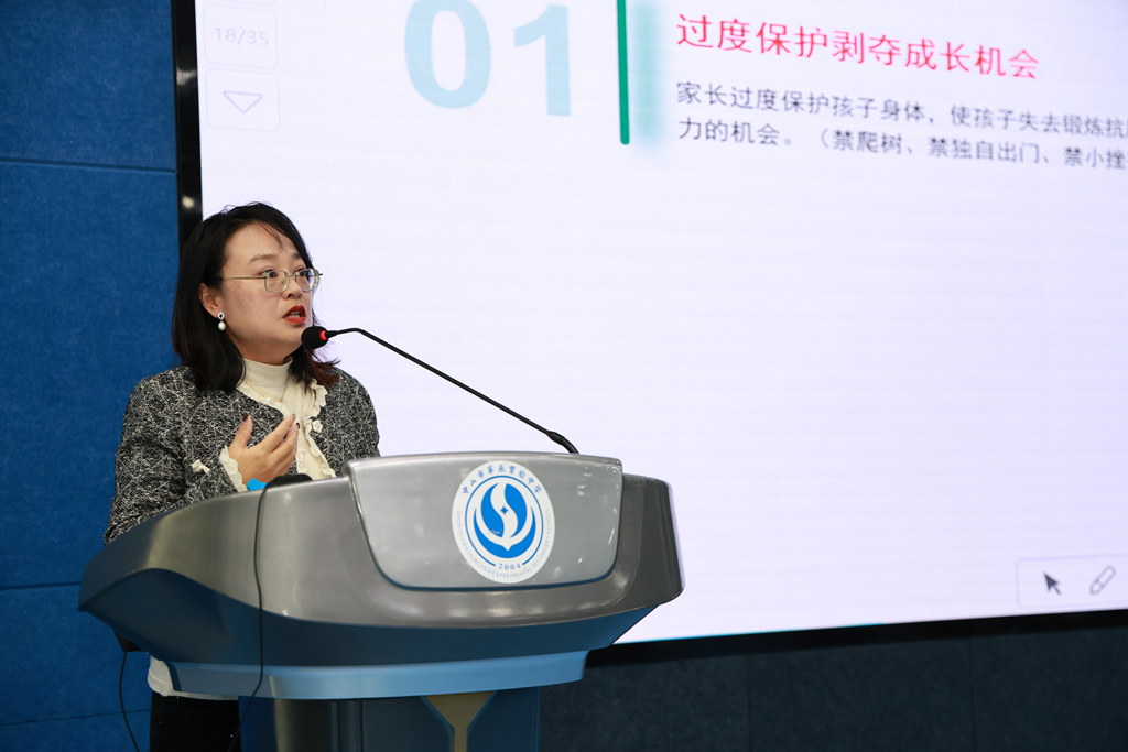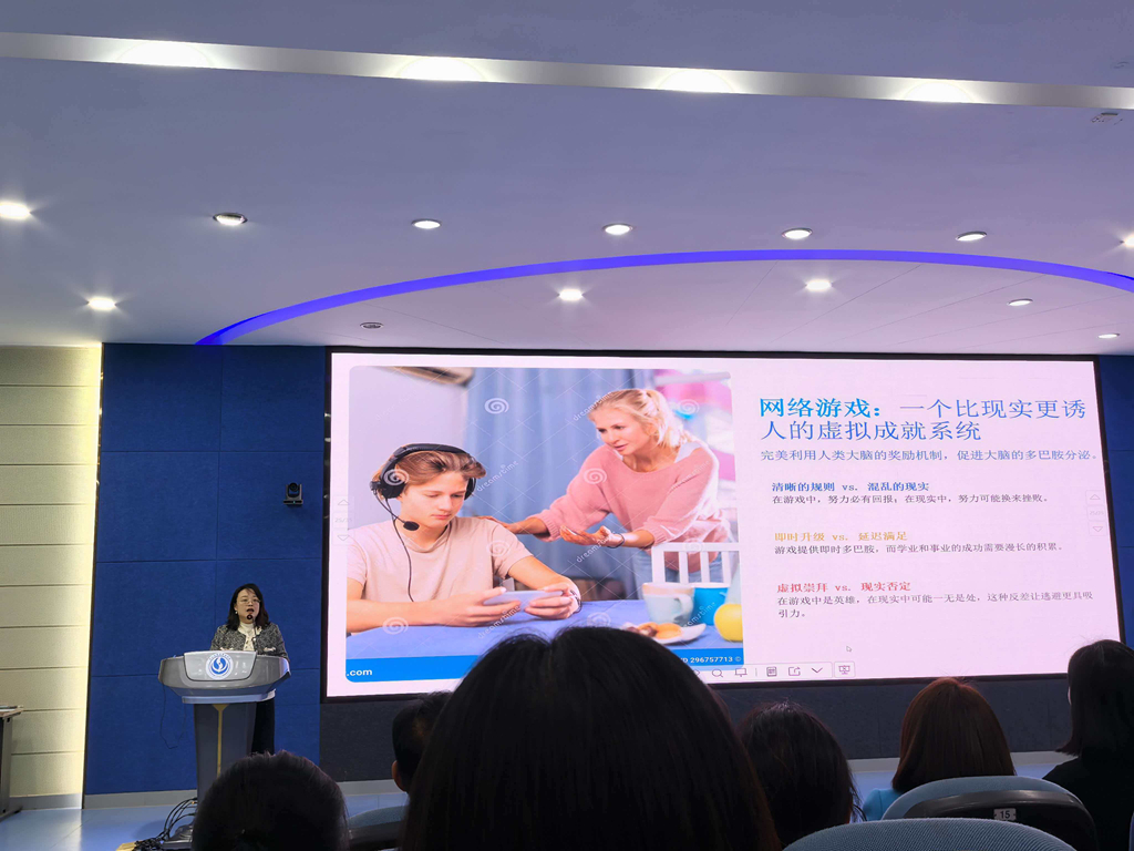 讲座开始前,强薇老师以“一站到底”的热身游戏拉开序幕,活跃了现场的气氛、拉近了彼此的距离,营造了宽松的氛围;接下来,强薇老师深度剖析了当代青少年成长的独特心理挑战,聚焦数字时代下的童年“突变”,引导家长们认识到当下青少年心理健康的形势严峻;她指出“过度保护”、“数字依赖”是导致当下青少年心理问题的主要成因;“过度保护”易摧毁青少年的抗脆弱性;沉迷社交媒体会让女孩成为数字的俘虏,深陷自我价值和认知的困境,网络游戏带来的成就感更让男孩容易渐渐依赖虚拟的数字世界,户外真实社交随之慢慢缺失,进而产生社会退缩心理;家庭养育中保护与管控的悖论也随之凸显,过度呵护叠加数字依赖,会大大削弱孩子的心理韧性;强薇老师明确指出,破局的关键是家庭延迟配备手机与学校禁带手机相结合、鼓励青少年进行更多的自由体验活动,在真实社交与实践中收获成就感,培育健全人格。