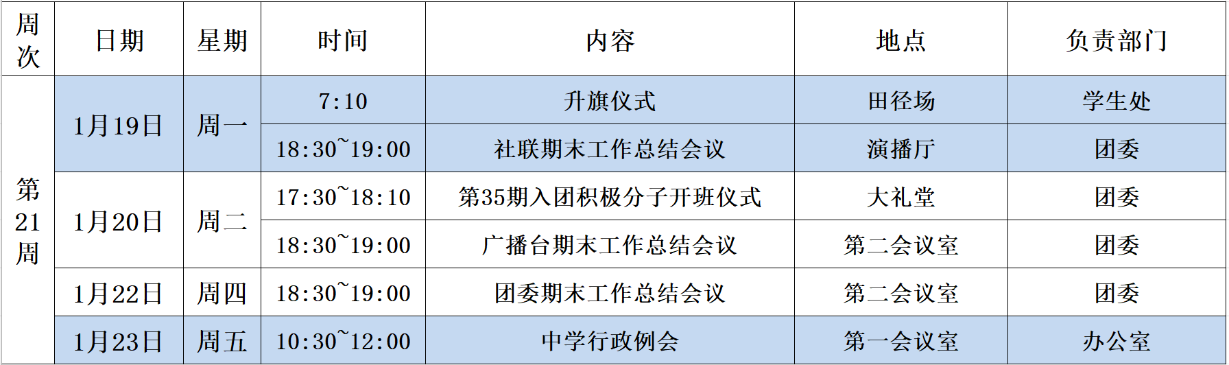 第21周中学校区工作安排(1月18日~1月24日)