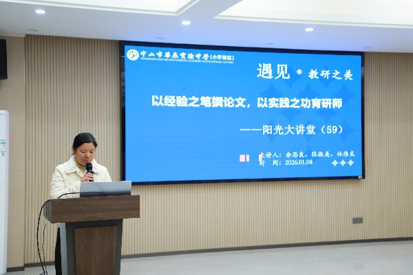 2026年1月8日晚,中山华实小学校区举行了第59期阳光大讲堂。本期主题为“以经验之笔撰论文,以实践之功育研师”,由余思良、张淑美、林伟良三位数学老师主讲,围绕如何把教学经验转化成教学论文展开阐述。