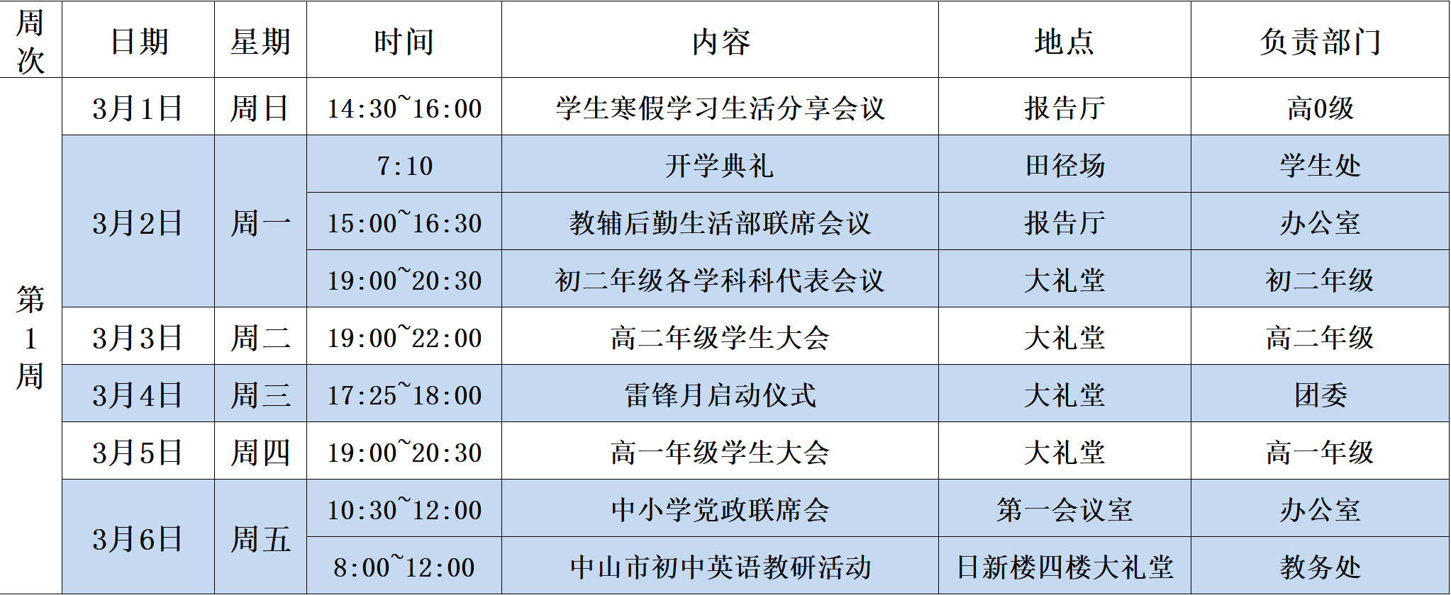 第1周中学校区工作安排(3月1日~3月7日)