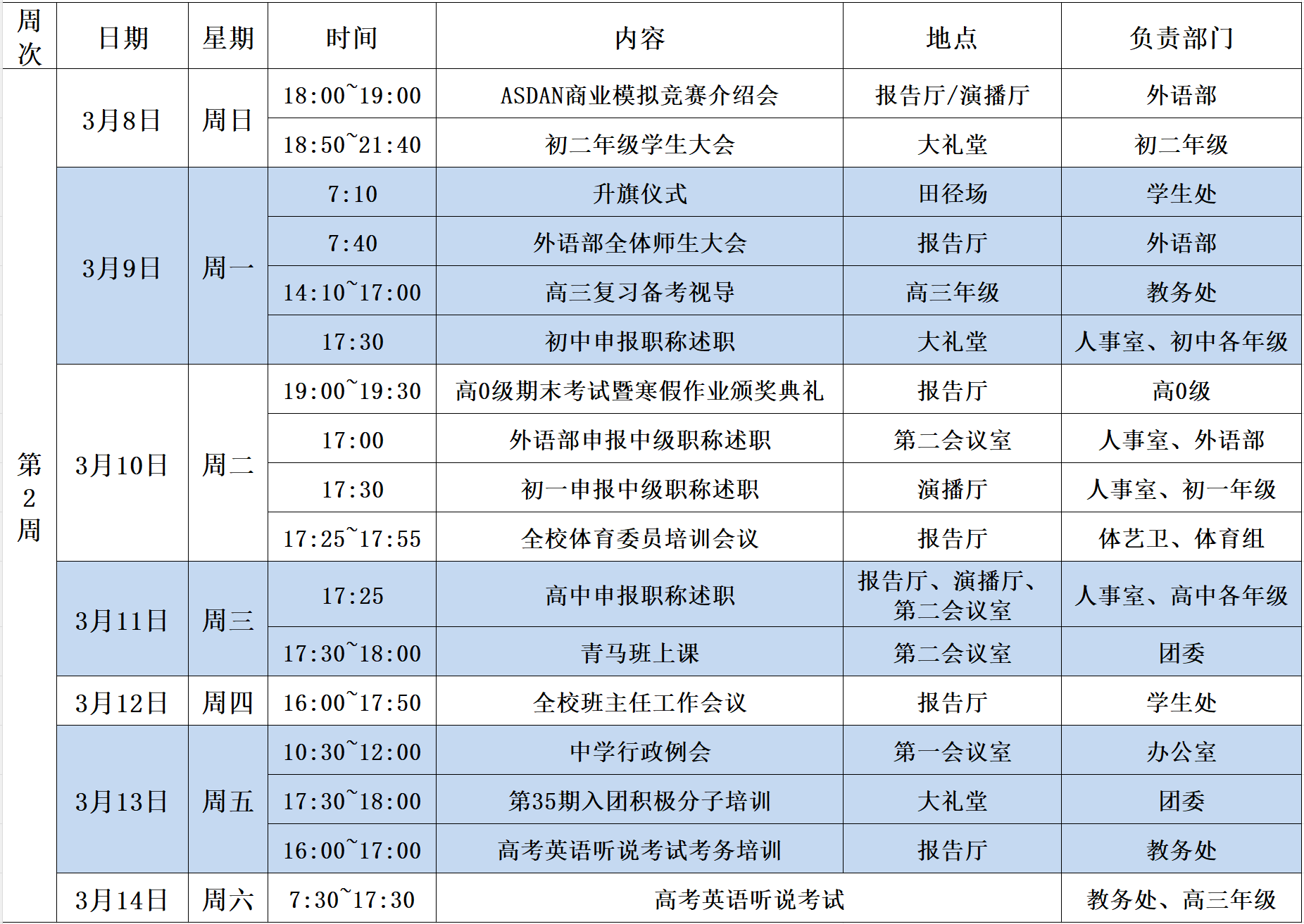 第2周中学校区工作安排(3月8日~3月14日)
