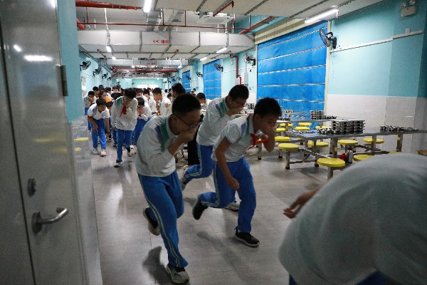 下午5时20分,随着疏散哨声响起,演练正式开始。正在餐厅用餐的学生在生活老师的引导下,迅速形成两列,弯腰低姿、用手捂住口鼻,沿着预设的疏散路线有序撤离。各楼道拐角处、台阶口、转弯处等关键位置均有老师值守,确保学生疏散过程安全顺畅。 在短短几分钟内,全体学生有序撤离至篮球场指定区域。生活老师迅速清点人数,并向年级主任林改平报告。