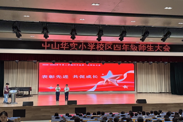 2026 年 4 月 9 日晚,中山华实小学校区四年级举开展新学期第一次师生大会,大会融学科特色展演、文艺创意演绎、荣誉表彰与校园赛事预告于一体,为春日校园添上了一抹昂扬向上的少年亮色。