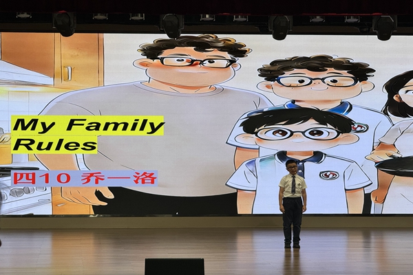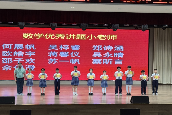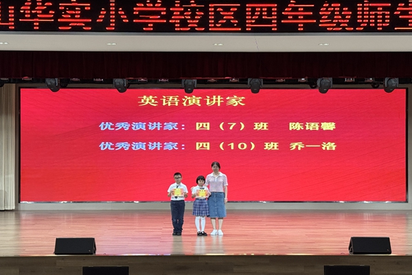 大会现场,孩子们各绽风采,语文 “轻叩诗歌大门” 特色展演中,四(2)班谢嘉瑾、谢嘉瑜,四(4)班、四(5)班的同学们以诗咏志,用声音传递文学之美;四(1)班接连带来《我们的课间》《路队风波》《读书包治百病》《华辰校园赞》等创意节目,于欢笑中传递文明准则、诠释书香内涵;数学 “讲题我能行” 视频展演、英语 “演讲我能行” 现场展示中,同学们自信从容,展现了扎实的学科素养。